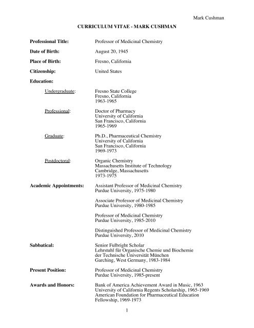 Curriculum Vitae For Mark Cushman Purdue College Of Pharmacy