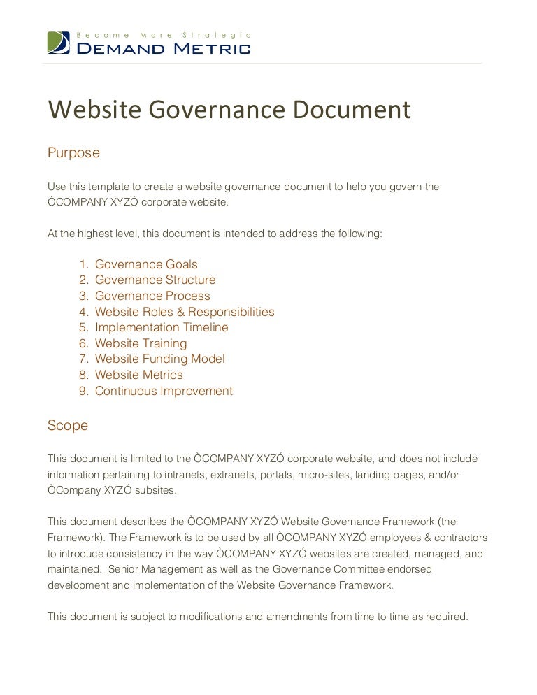 It governance document template. Please note that SharePoint Governance document should be a living and breathing document and it must be changed accordingly as new technologies and best practices emerge and are adopted. IT Governance is a challenge that should not be underestimated. IT Governance is a mechanism that an organizations executive leadership uses to control and direct information technology.