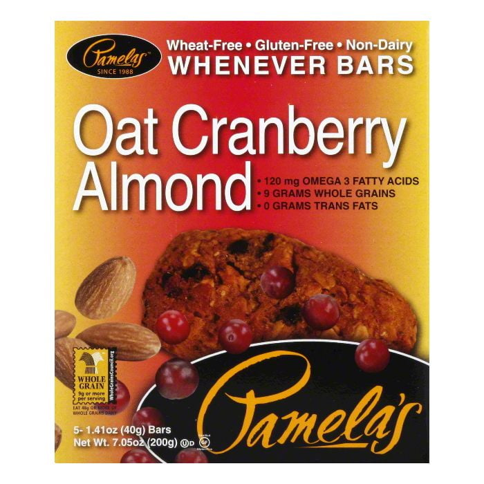One person found this helpful. Peaceful Squirrel Variety Pamelas Whenever Oat Bars Gluten-Free Non-Dairy Variety of 6 Boxes 5 Flavors Oat Raisin Walnut Spice Oat Cranberry Almond Oat Peanut Butter Chocolate Chip Oat Blueberry Lemon Oat Chocolate Chip Coconut. Cranberries and almonds make a delicious duo in Pamelas Cranberry Almond Whenever Bars.