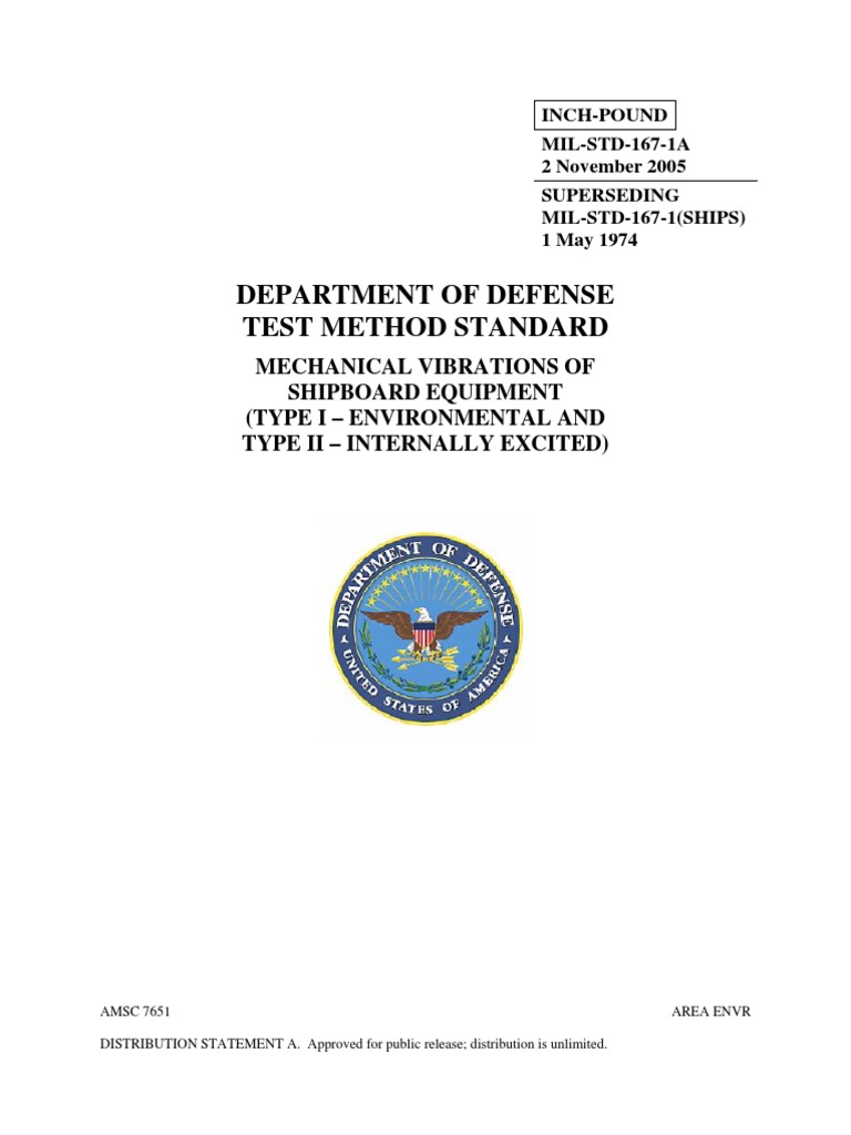 MECHANICAL VIBRATIONS OF SHIPBOARD EQUIPMENT TYPE I-ENVIRONMENTAL AND TYPE II-INTERNALLY EXCITED 01 MAY 1974 SUPERSEDES MIL-STD-167B This standard specifies procedures and establishes requirements for environmental and internally excited vibration testing of Naval shipboard equipment installed on ships with conventionally. September 29 2016 Create Date. This standard was replaced in 1974 by Parts 1 and 2 MIL-STD-1671 and MIL-STD-1672.