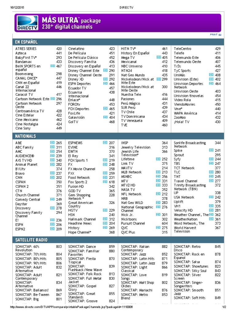 ALL PROGRAMMING SUBJECT TO CHANGE AT ANY TIME. 243 rows DIRECTV MÁS ULTRA Package Channel Line-up. Up to 75 cash back Get DIRECTV ÓPTIMO MÁS Package for 6999mo.